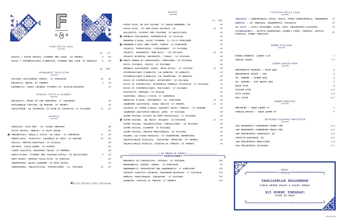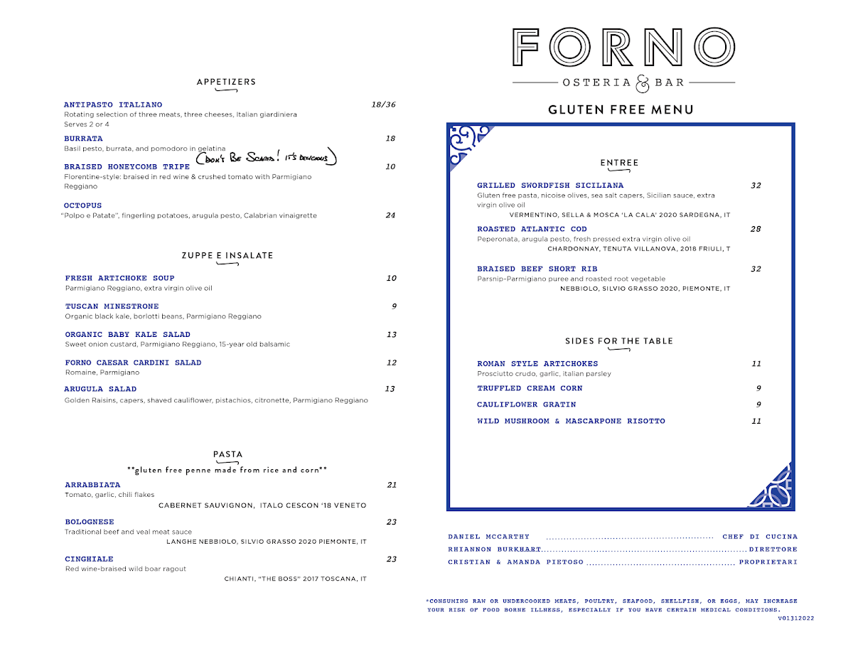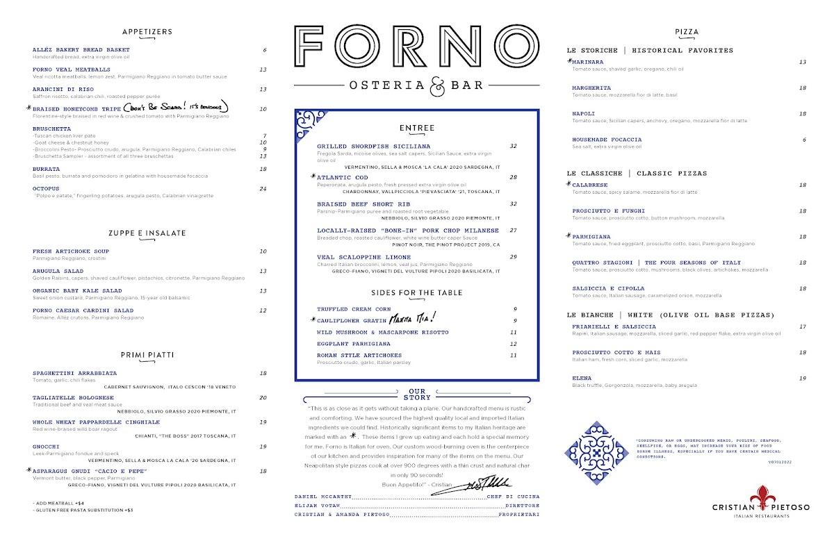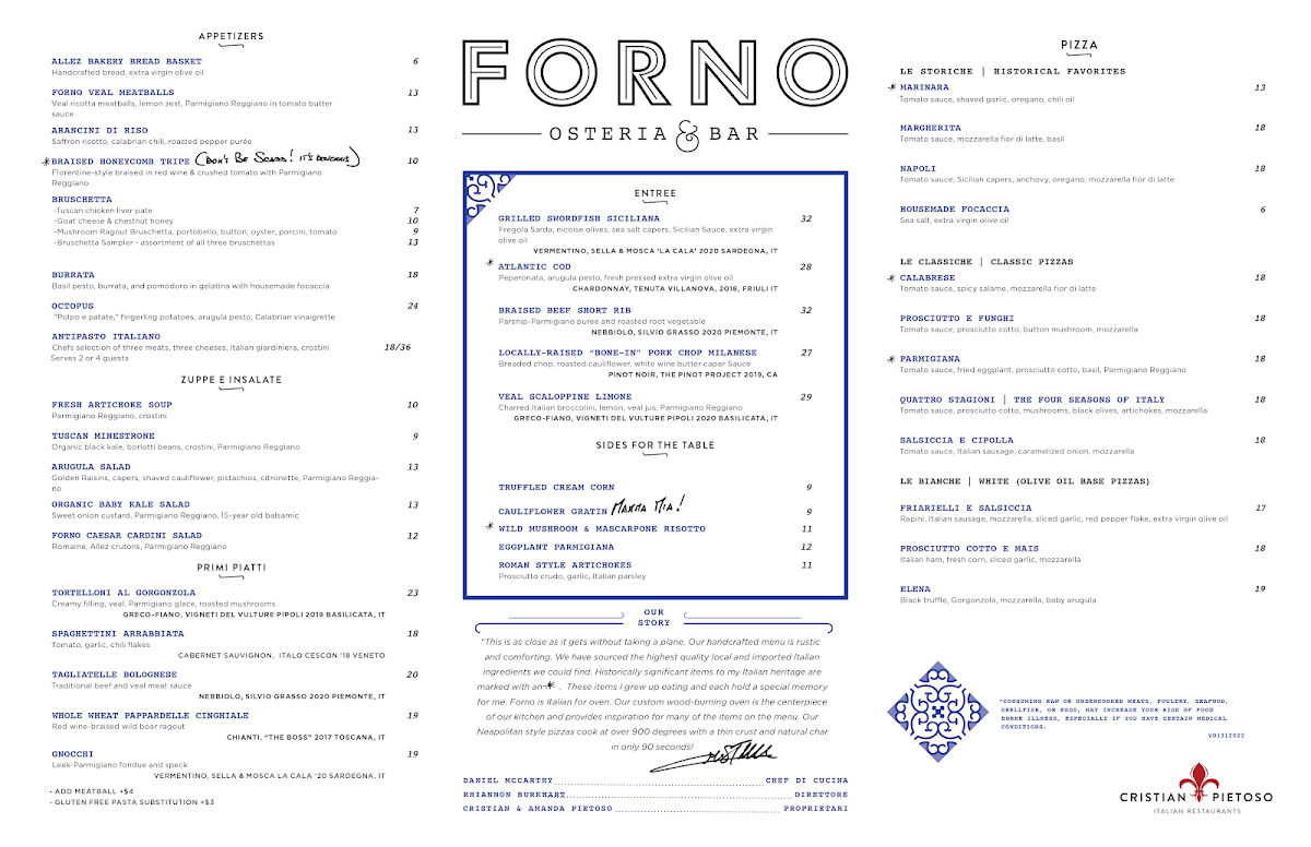 Forno Osteria & Bar Montgomery offers a thoughtfully curated menu that showcases the best of Italian cuisine, combining traditional dishes with fresh, local ingredients. Starting with the Antipasti, Zuppe & Insalate section, diners can enjoy an array of flavorful appetizers such as the Allez Bread Basket and the hearty Forno Veal Meatballs, or dive into the crispy and savory Arancini Di Riso. For something indulgent, the Stracchino Prosciutto E Coccoli and creamy Burrata are also excellent choices.