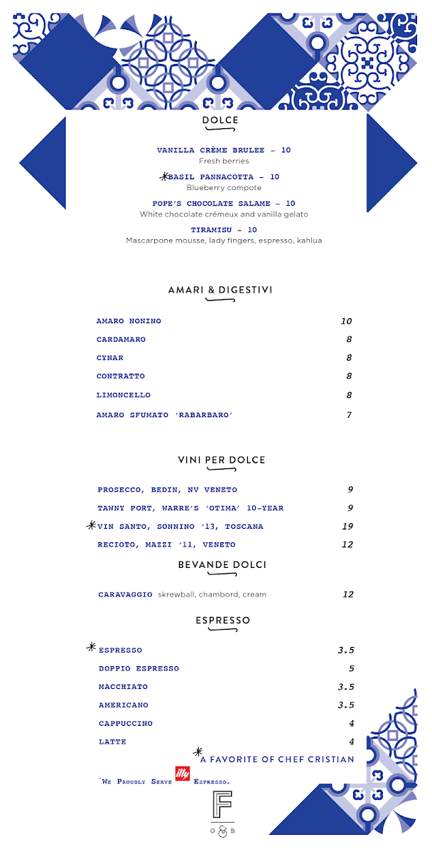 When it comes to desserts, Creme Brulee and Pannacotta are delightful options, while the rich Pope's Chocolate Tiramisu is sure to satisfy any sweet tooth. The Trio dessert offers a wonderful sampling of Forno's signature sweets.