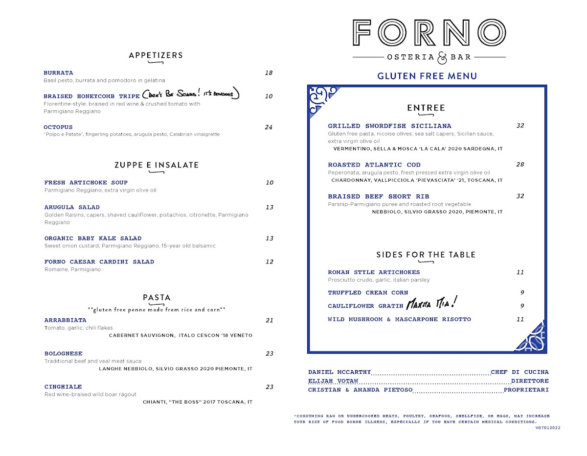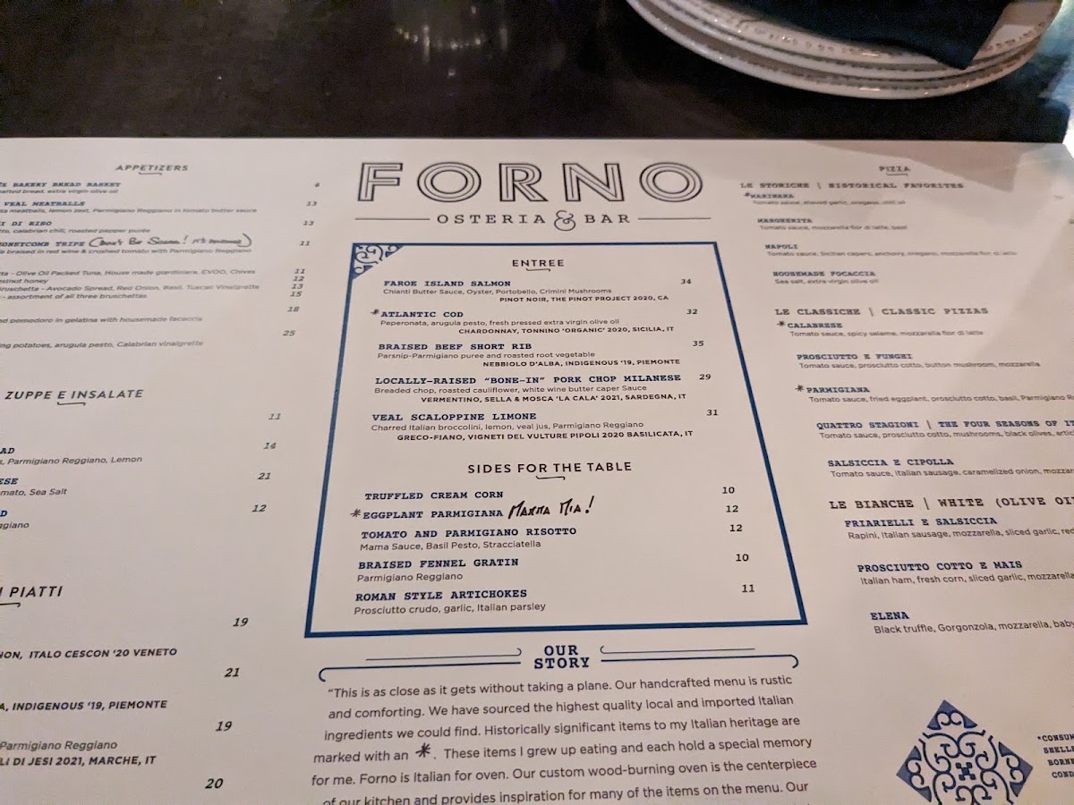To complement these dishes, Forno offers a variety of Sides for the Table such as the decadent Truffled Cream Corn, the crispy Eggplant Parmigiana, and the flavorful Forno Fingerling Potatoes. Also notable are the creamy Cauliflower Gratin and the savory Roman Style Artichokes, both adding an extra layer of indulgence to the meal.